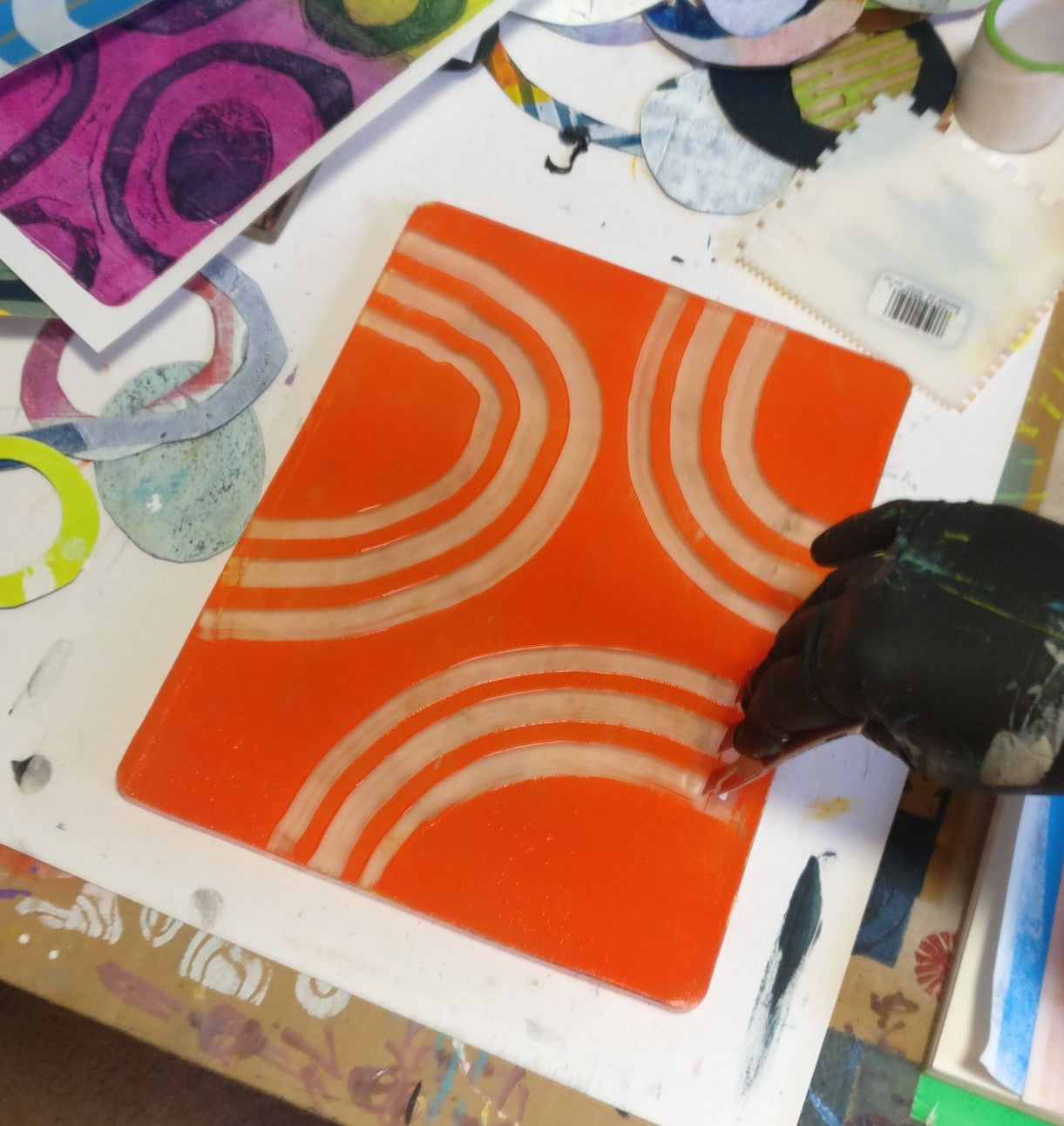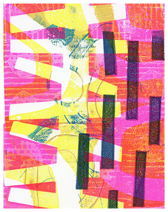 In this 2-day workshop we'll dive deep into play with found textures and stencils, and then make a plan for creating abstract monotypes that can stand on their own.