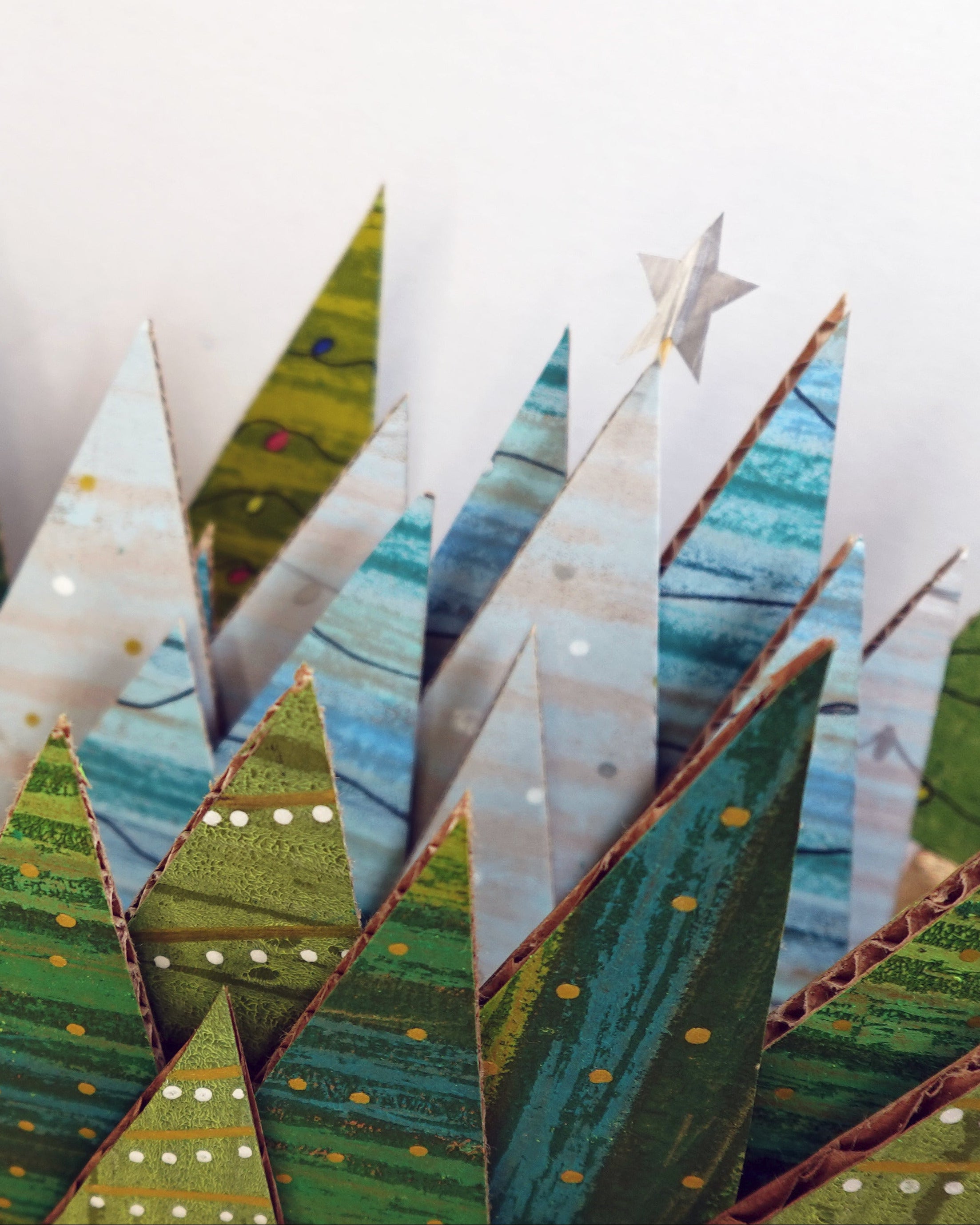 Cardboard Trees - One of my favorite gel-printing materials is…cardboard! But, instead of using it to create texture in our prints, we’ll be using it as our printing surface. We’ll also pull out our oil pastels (or crayons) for a gel printing resist technique to create lines of distressed texture. After printing, we’ll cut and embellish our cardboard to create a forest of Christmas trees.