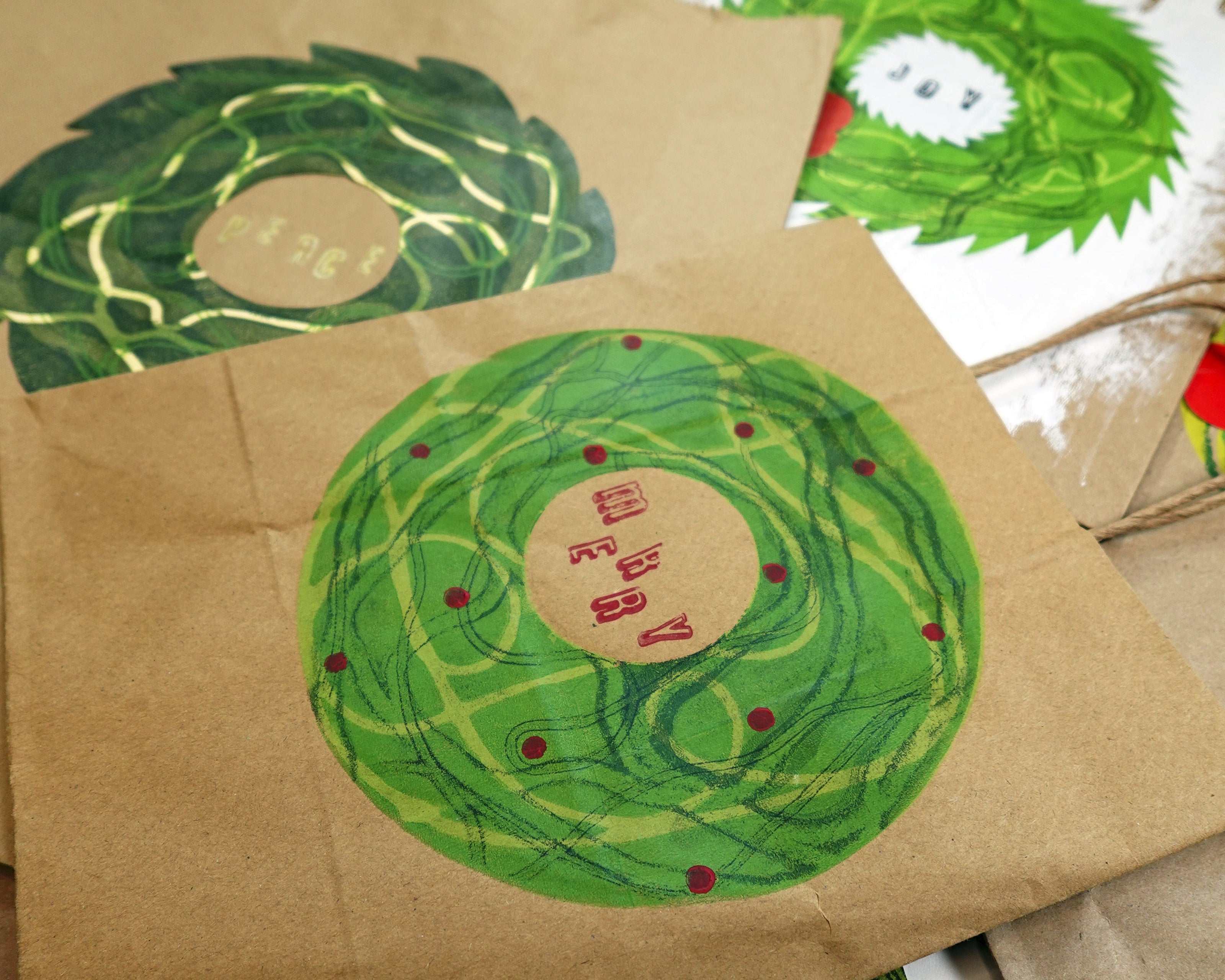 String Wreaths - Using yarn, thread, and cotton string as both a mask and ghost texture on our gel plate to create holiday wreaths for gift bags. This project also teaches you how to use the tape registration method with your printing surface and stencils.