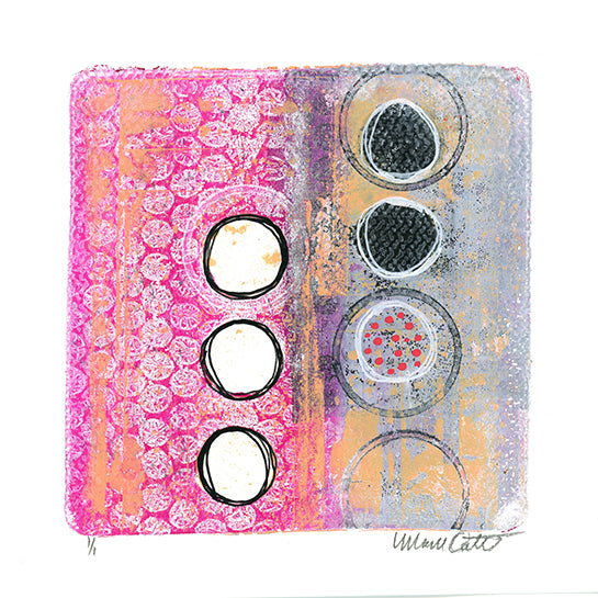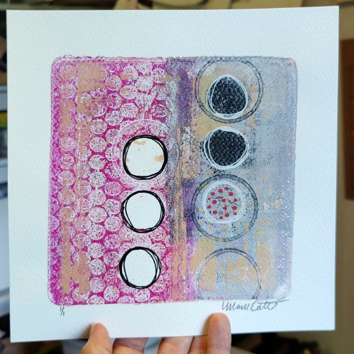 An original abstract gel print on 8" x 8" watercolor paper.