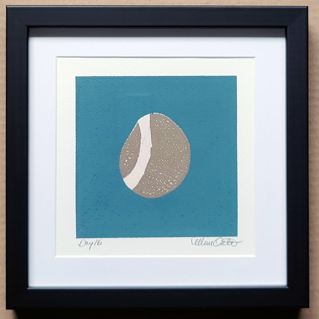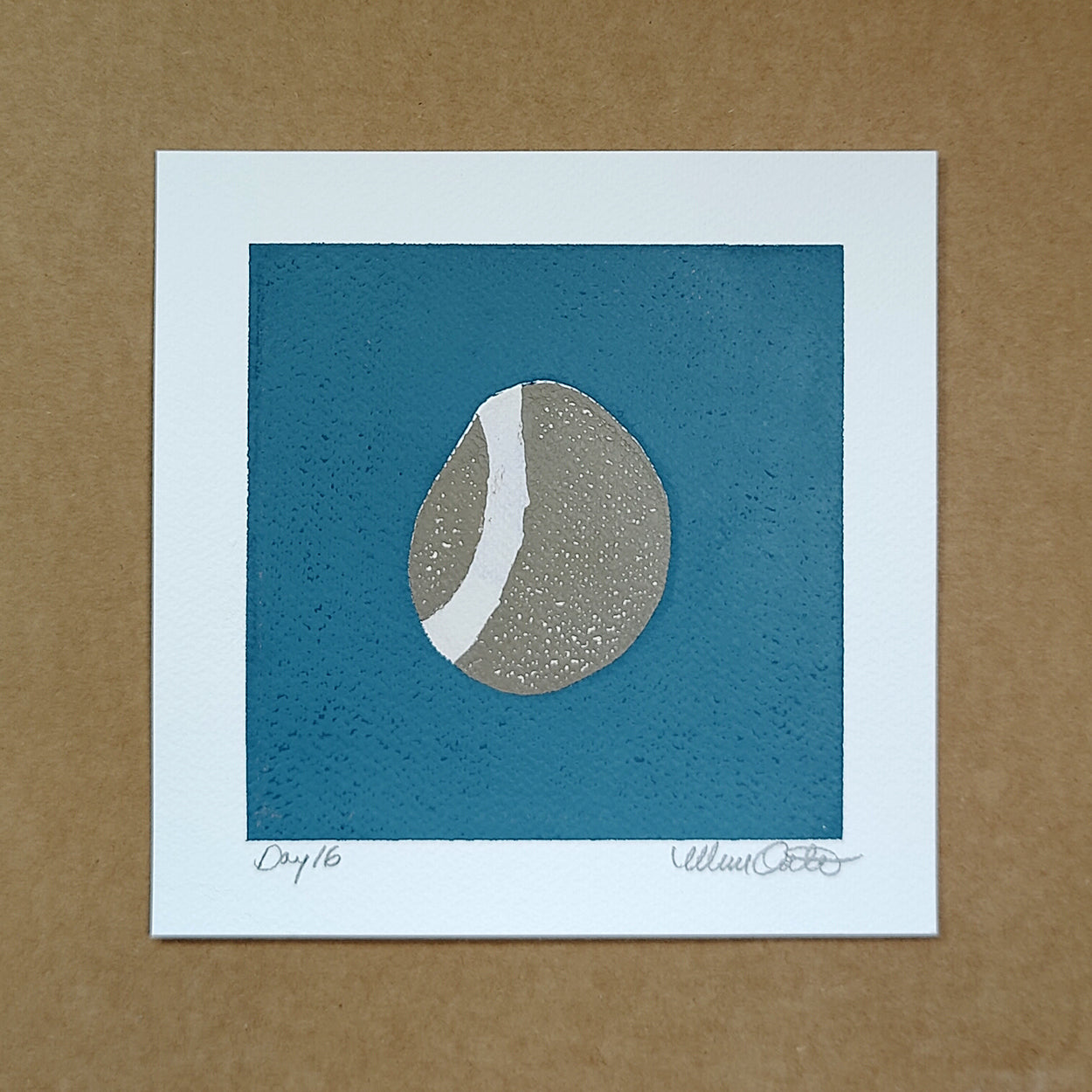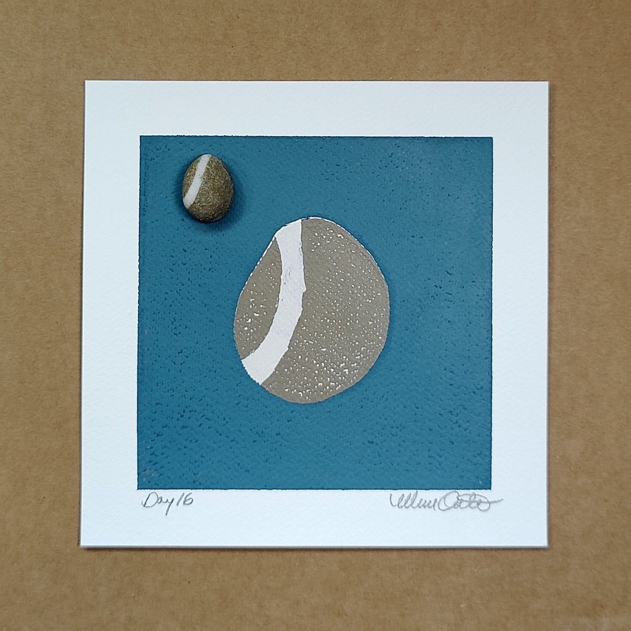 "Day 16" is a gel printed rock from my 100-day project of rocks in Spring 2025. Each piece from this series is on 8" x 8", 140lb—cold-press watercolor paper.