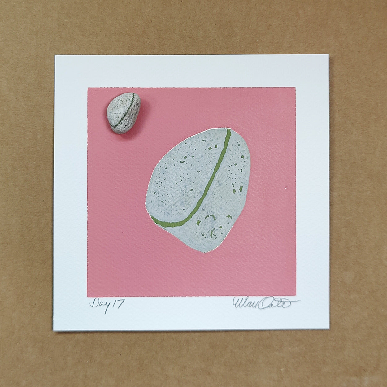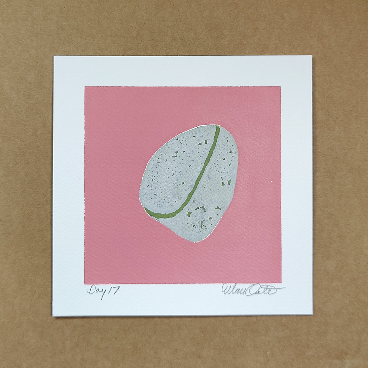 "Day 17" is a gel printed rock from my 100-day project of rocks in Spring 2025. Each piece from this series is on 8" x 8", 140lb—cold-press watercolor paper.