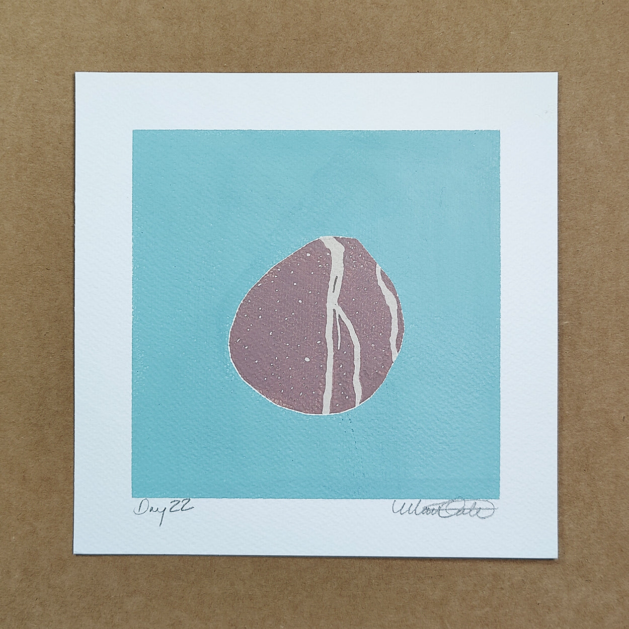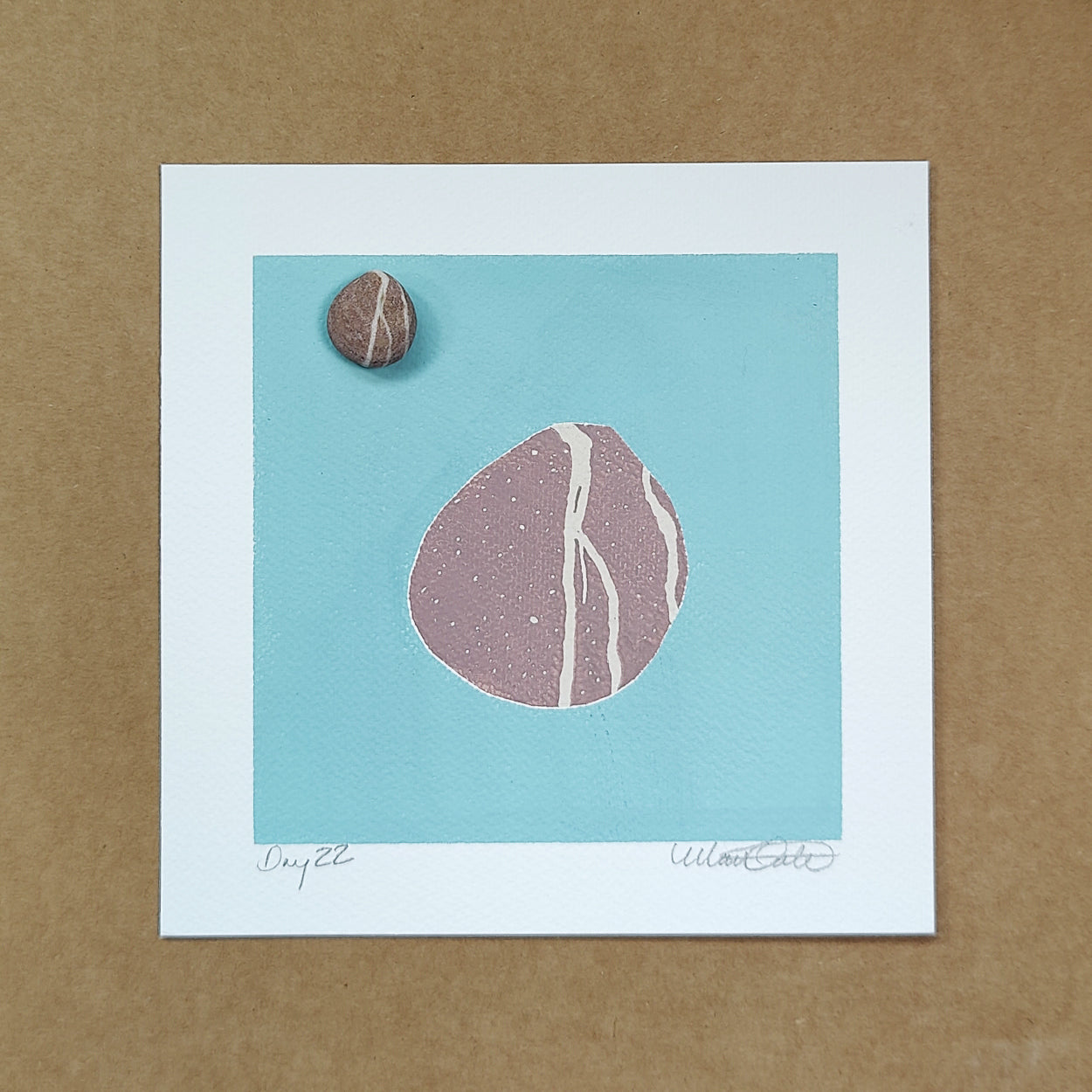"Day 22" is a gel printed rock from my 100-day project of rocks in Spring 2025. Each piece from this series is on 8" x 8", 140lb—cold-press watercolor paper.
