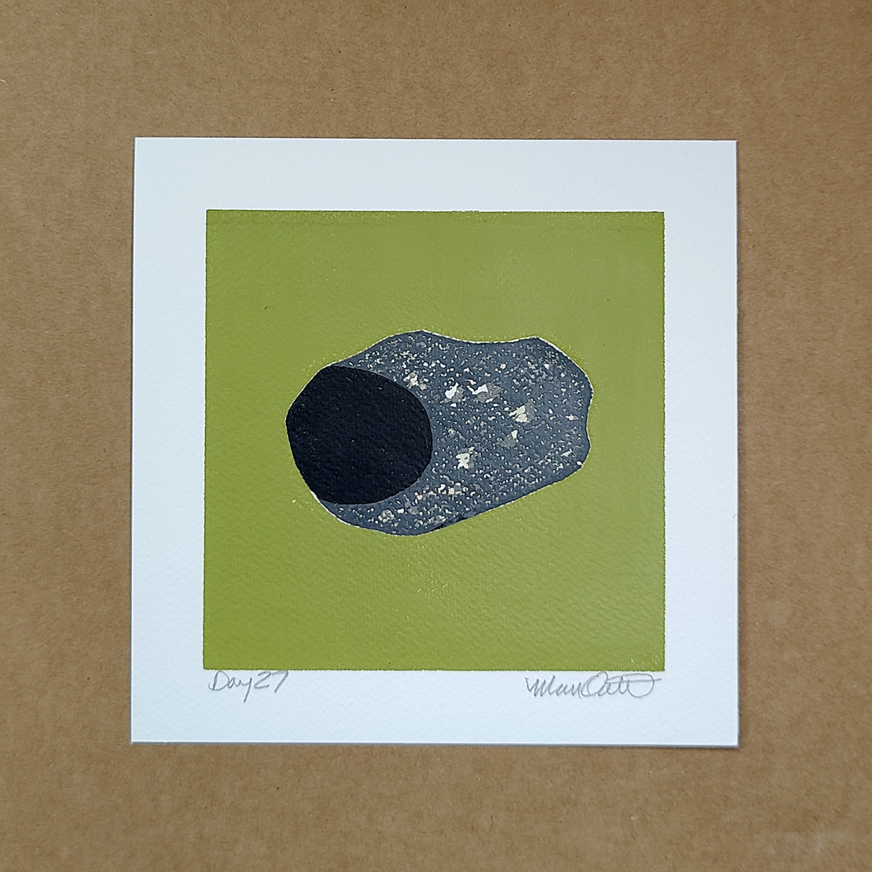 "Day 27" is a gel printed rock from my 100-day project of rocks in Spring 2025. Each piece from this series is on 8" x 8", 140lb—cold-press watercolor paper.