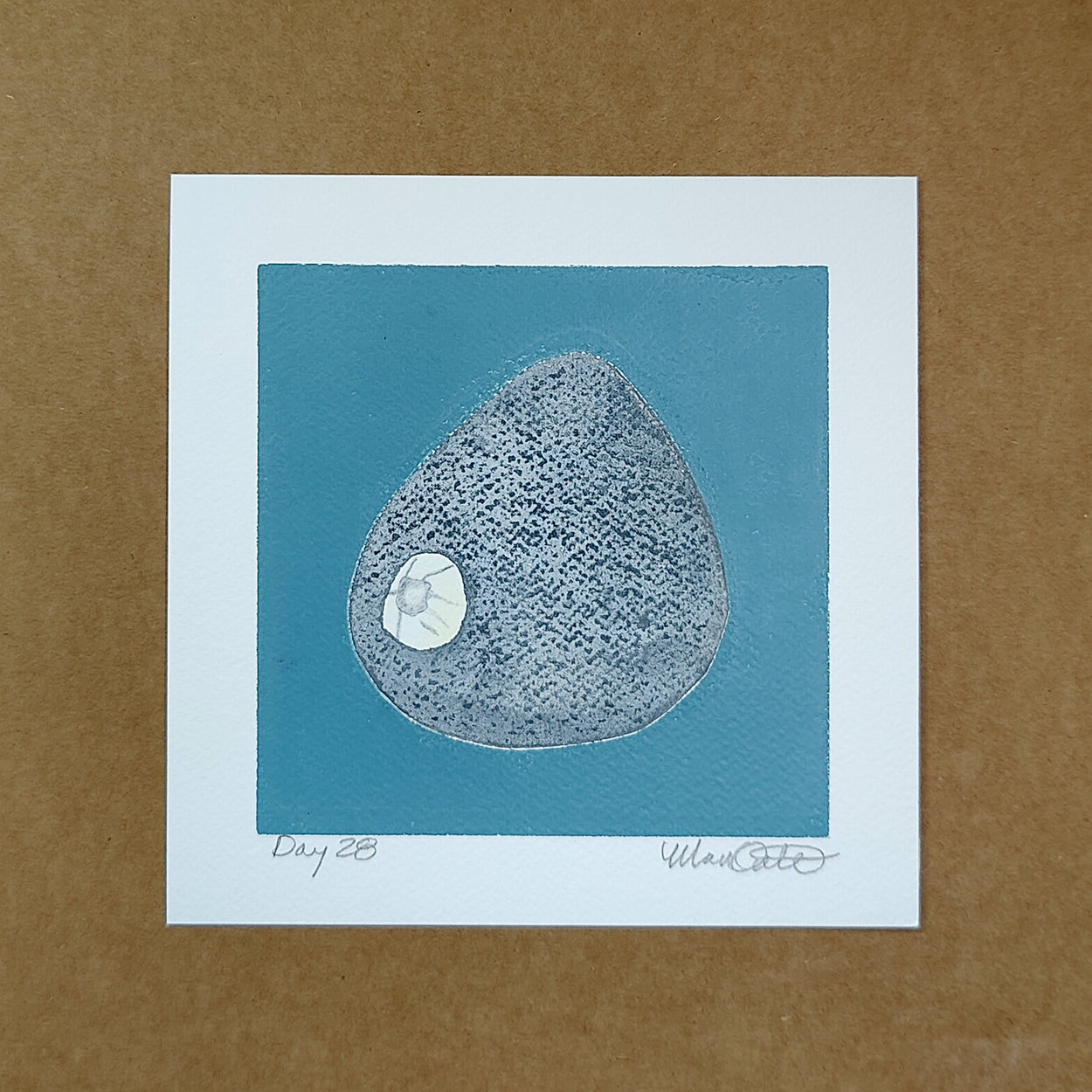 "Day 28" is a gel printed rock from my 100-day project of rocks in Spring 2025. Each piece from this series is on 8" x 8", 140lb—cold-press watercolor paper.