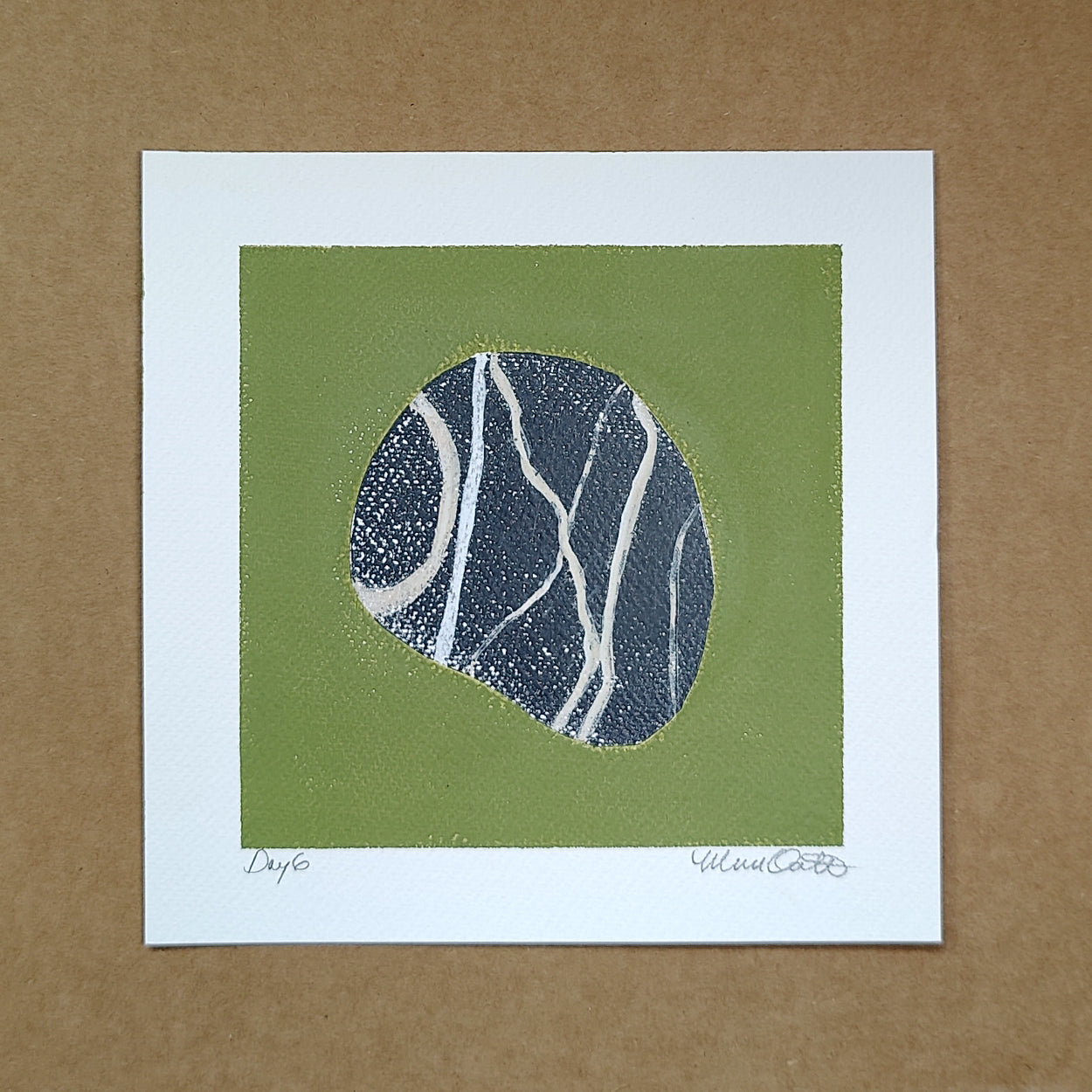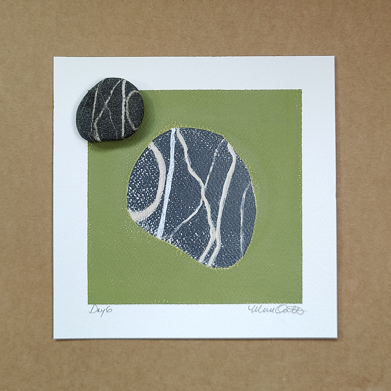 "Day 6" is a gel printed rock from my 100-day project of rocks in Spring 2025. Each piece from this series is on 8" x 8", 140lb—cold-press watercolor paper.
