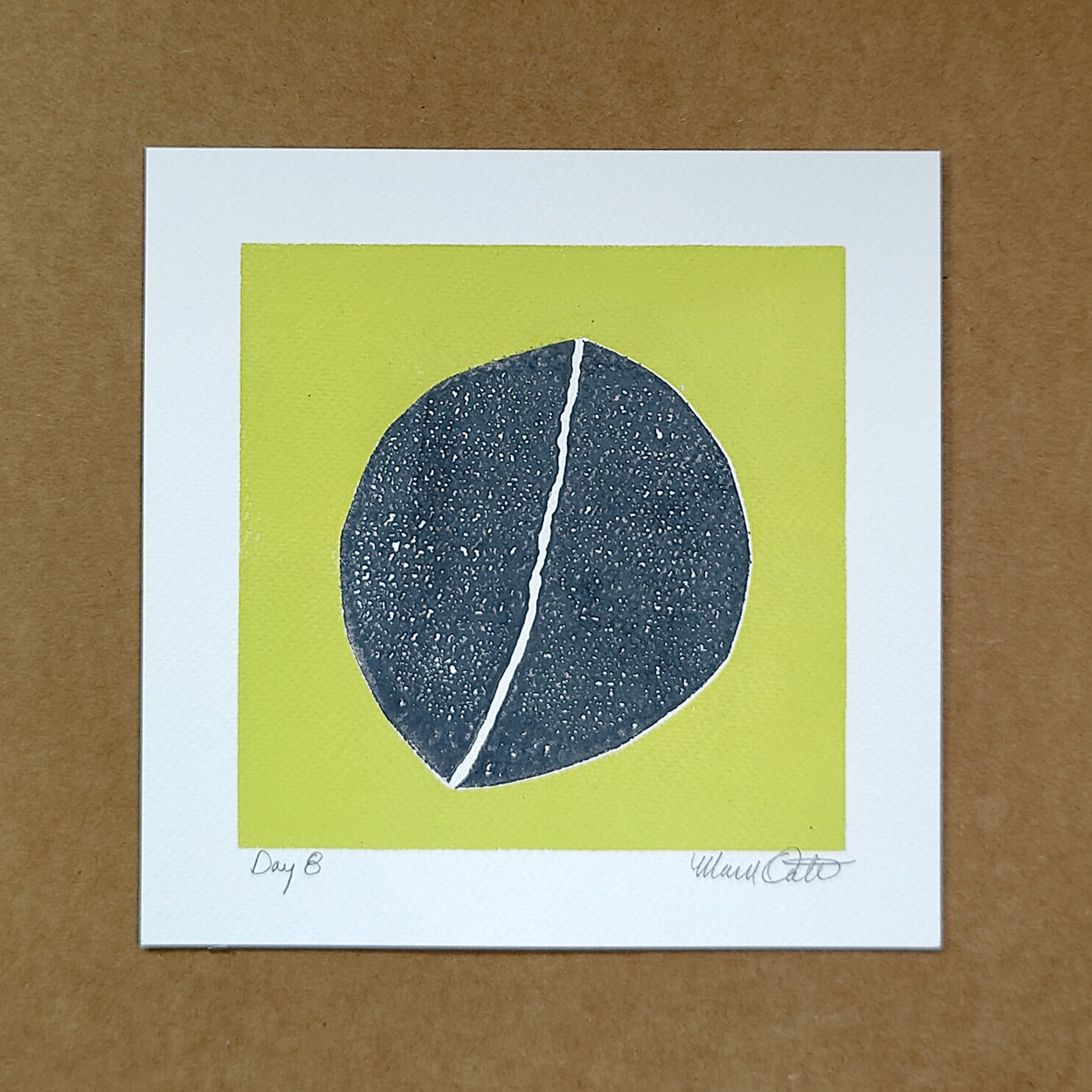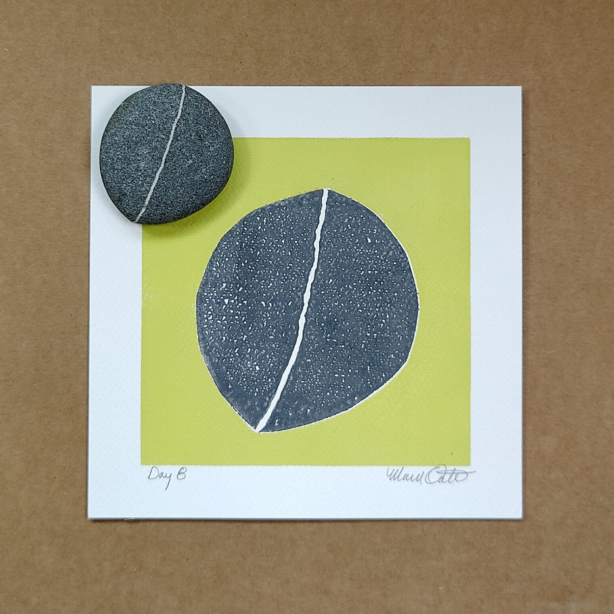 "Day 8" is a gel printed rock from my 100-day project of rocks in Spring 2025. Each piece from this series is on 8" x 8", 140lb—cold-press watercolor paper.