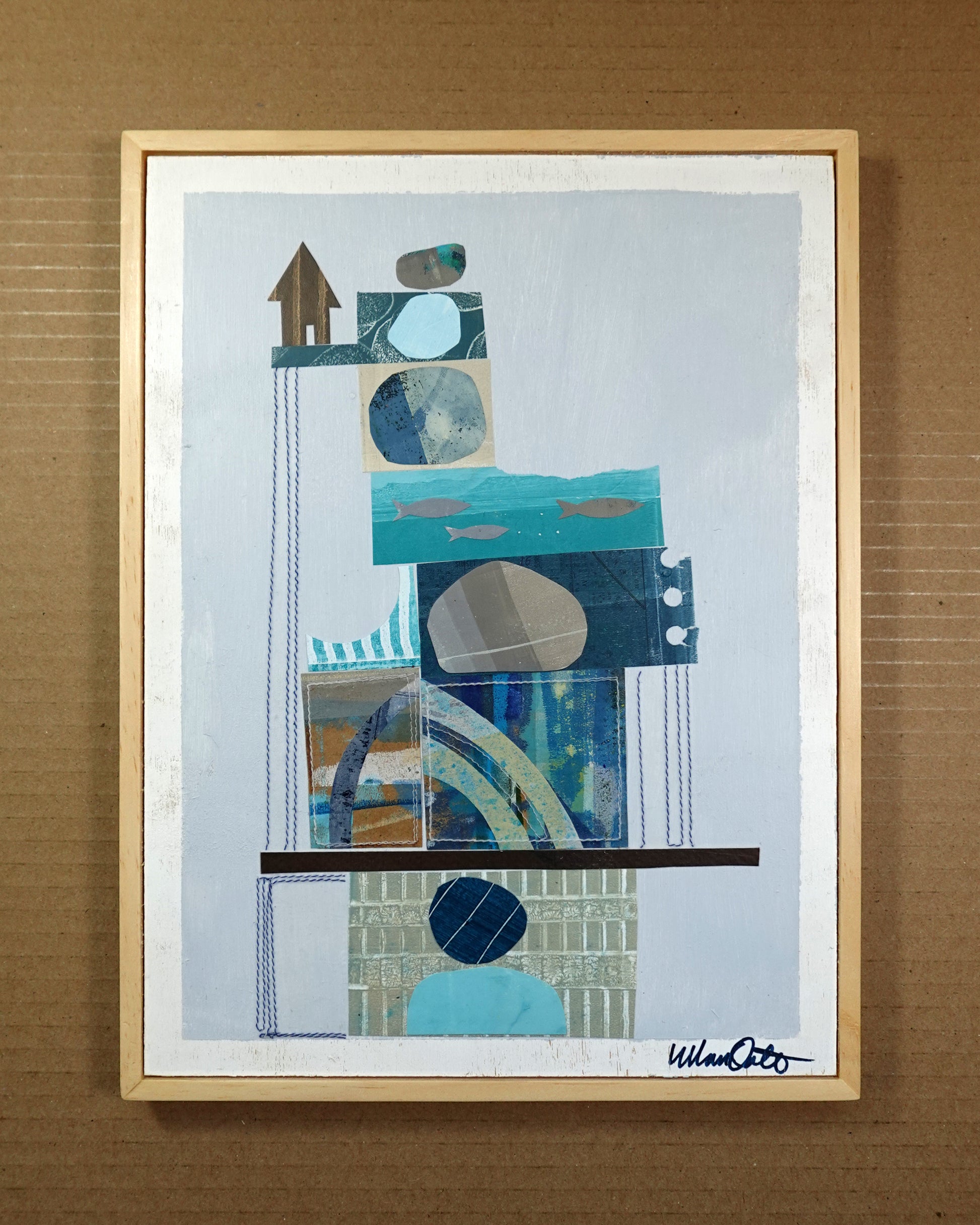 Friday Stack is a 9” x 12” (22.86 x 30.48 cm) mixed media collage on wood panel created with a mixture of hand-printed and stitched papers.