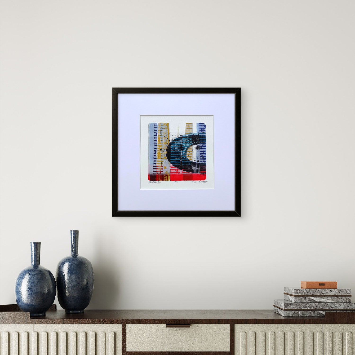 Original acrylic monotype on watercolor paper with embroidery and machine stitching. Artwork area is 6" x 6".