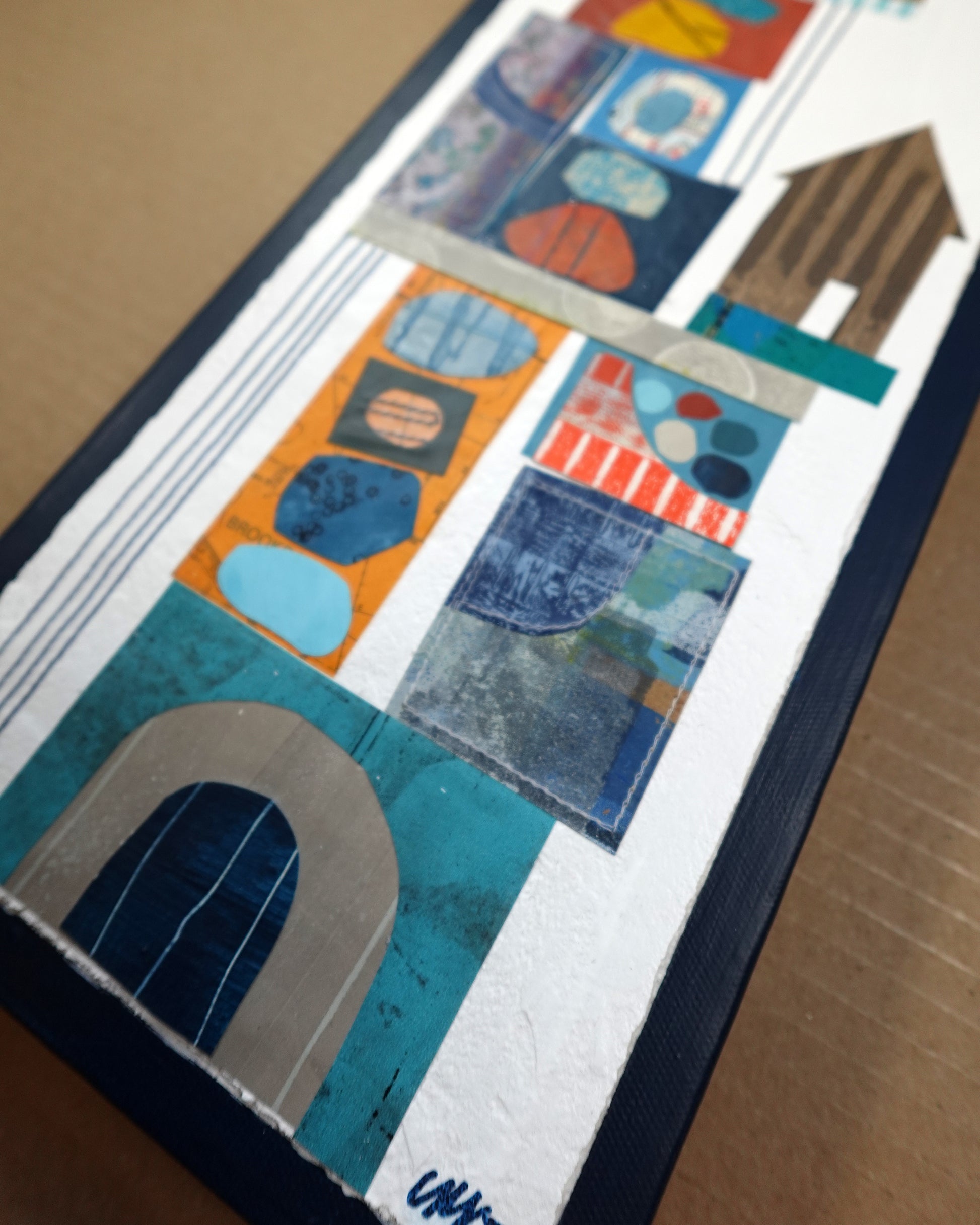 Monday Stack is a 6.5” x 16” (16.51 x 40.64 cm) mixed media collage on a canvas panel created with a mixture of hand-printed and stitched papers. The collage area also sits on a slightly raised, textured area created by building up several layers of fiber paste on the surface of the canvas.