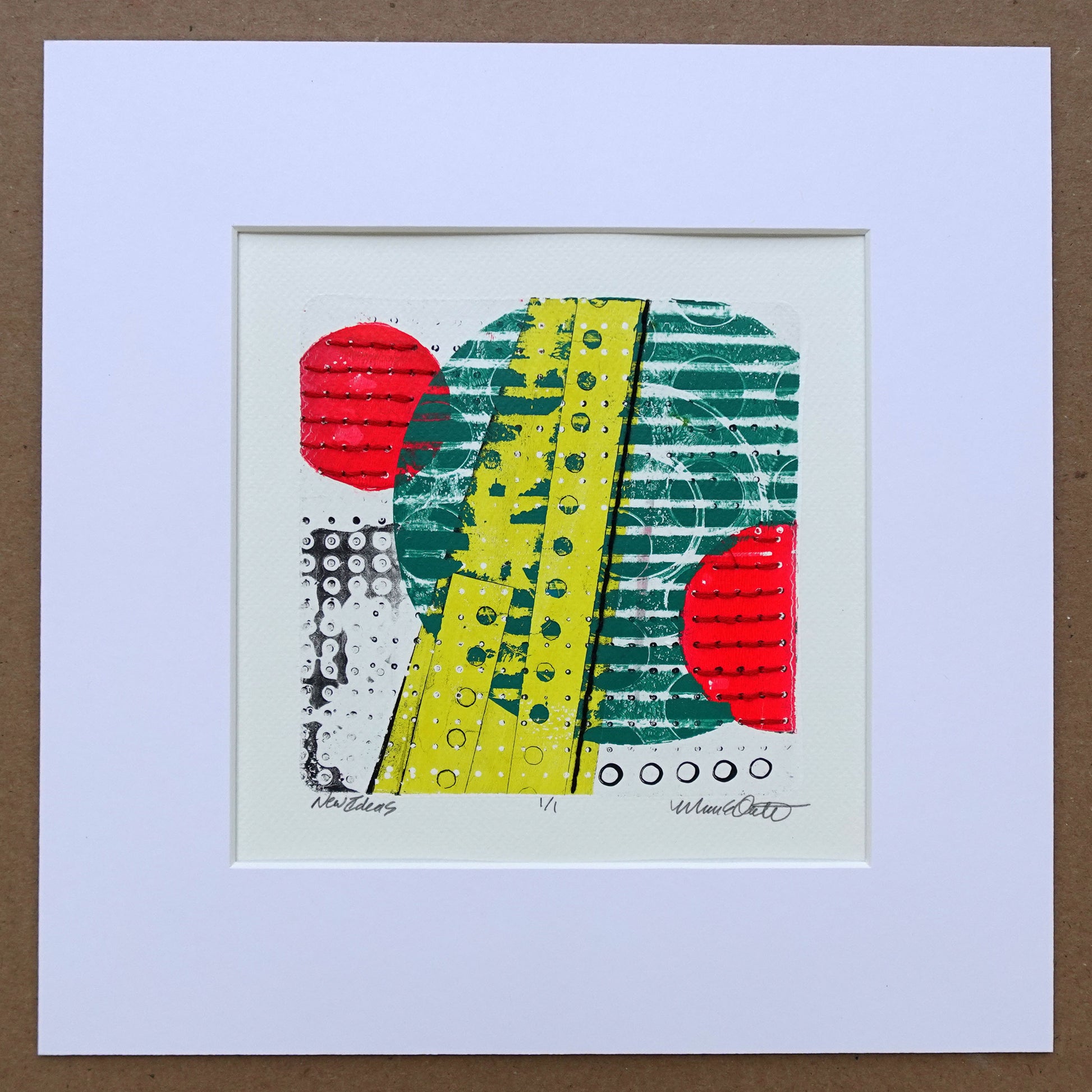 Original acrylic monotype on watercolor paper with embroidery. Artwork area is 6" x 6".