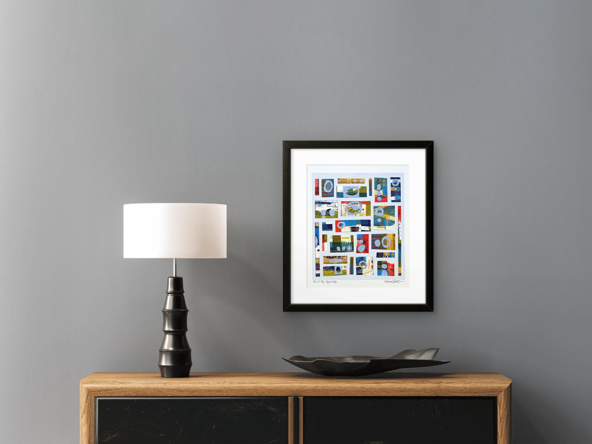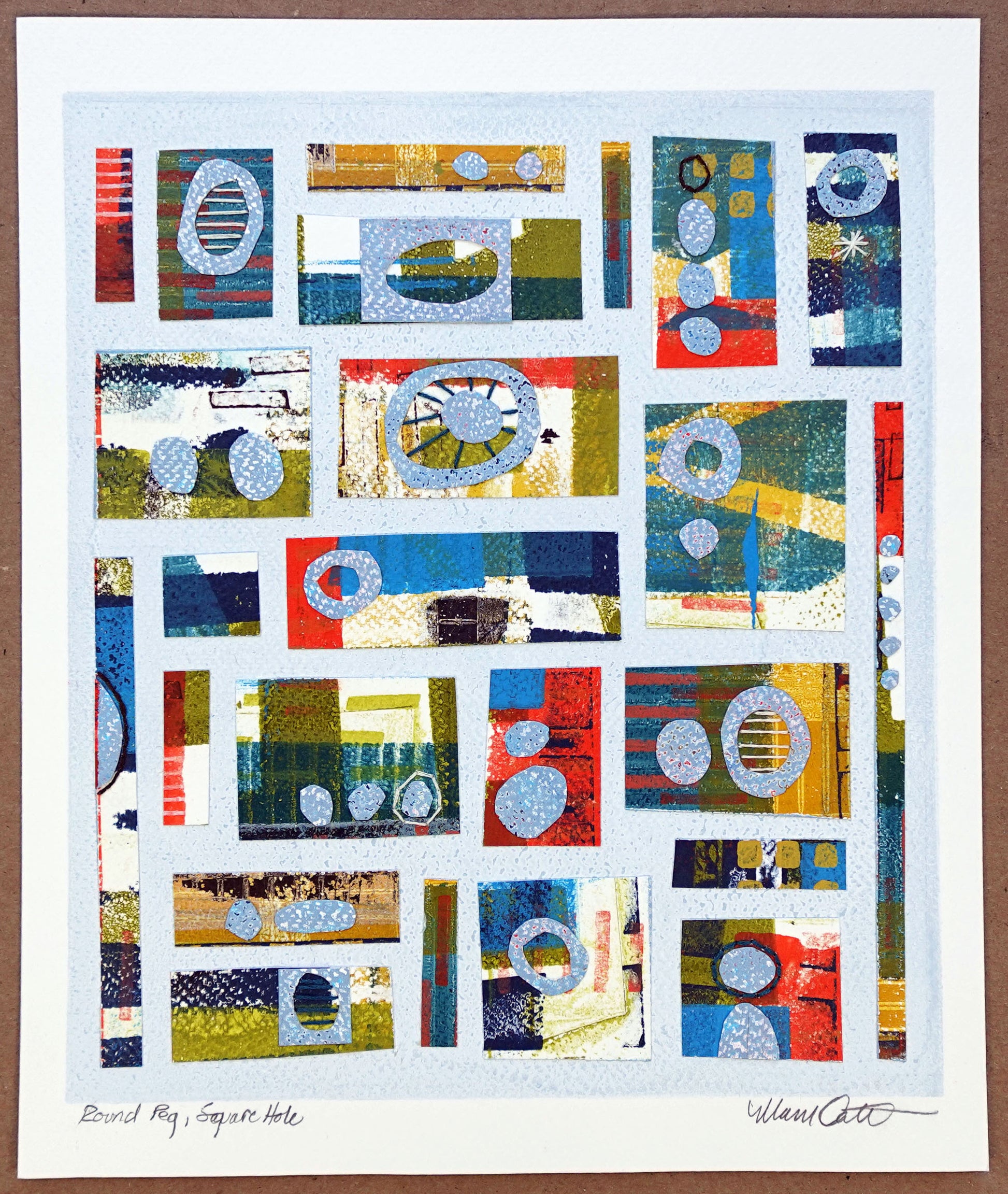 "Round Peg, Square Hole" is an original collage made from gel printed papers and embroidery thread on watercolor paper.