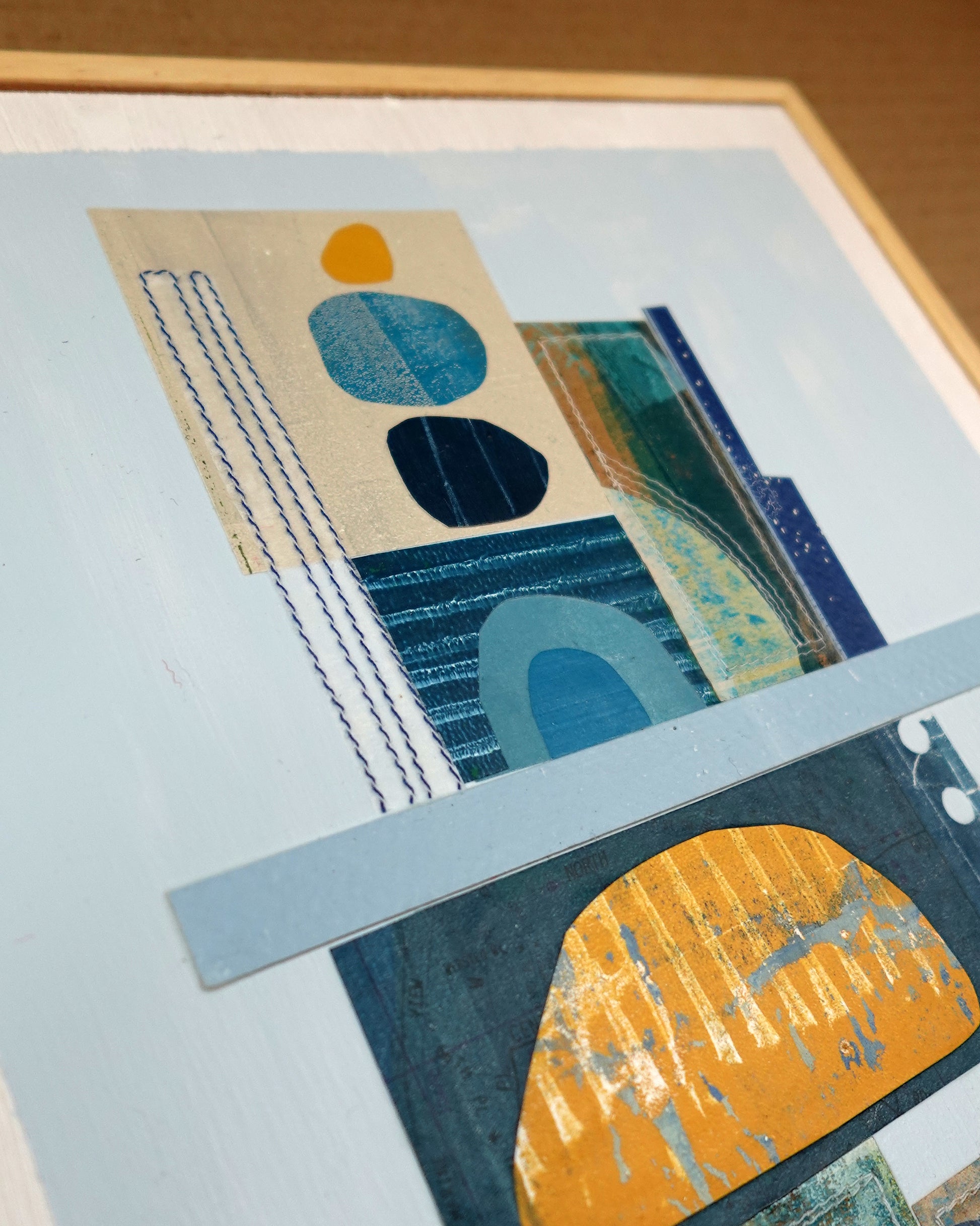 Saturday Stack is a 9” x 12” (22.86 x 30.48 cm) mixed media collage on wood panel created with a mixture of hand-printed and stitched papers.