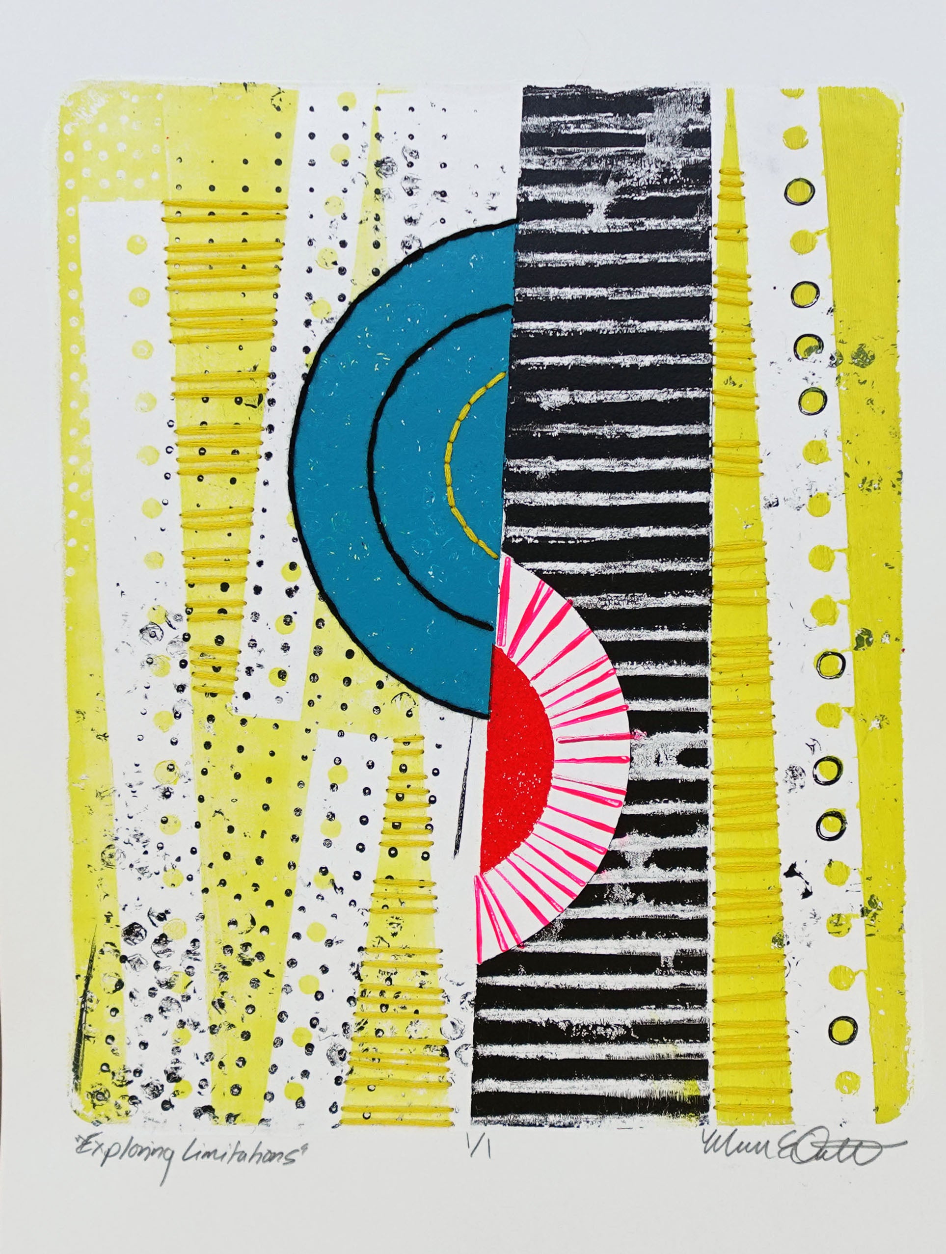 Original acrylic monotype on 9"x 12" Bristol paper with embroidery. Artwork area is 8" x 10".