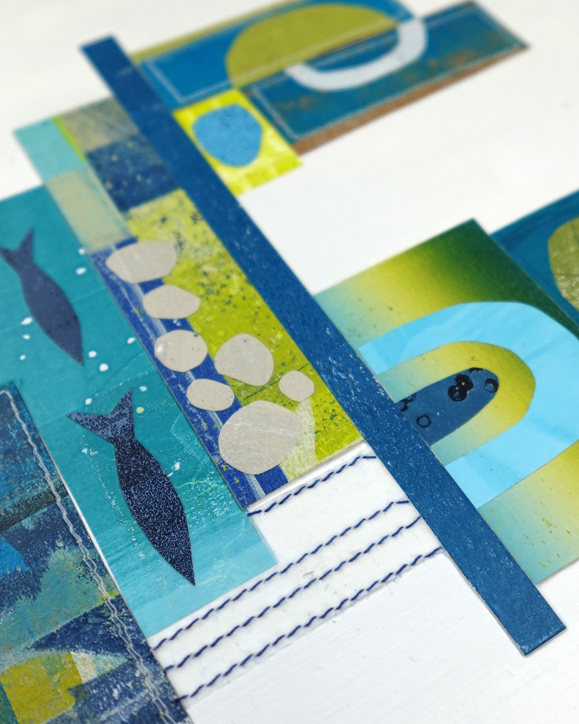 Thursday Stack is a 9” x 12” (22.86 x 30.48 cm) mixed media collage on wood panel created with a mixture of hand-printed and stitched papers.