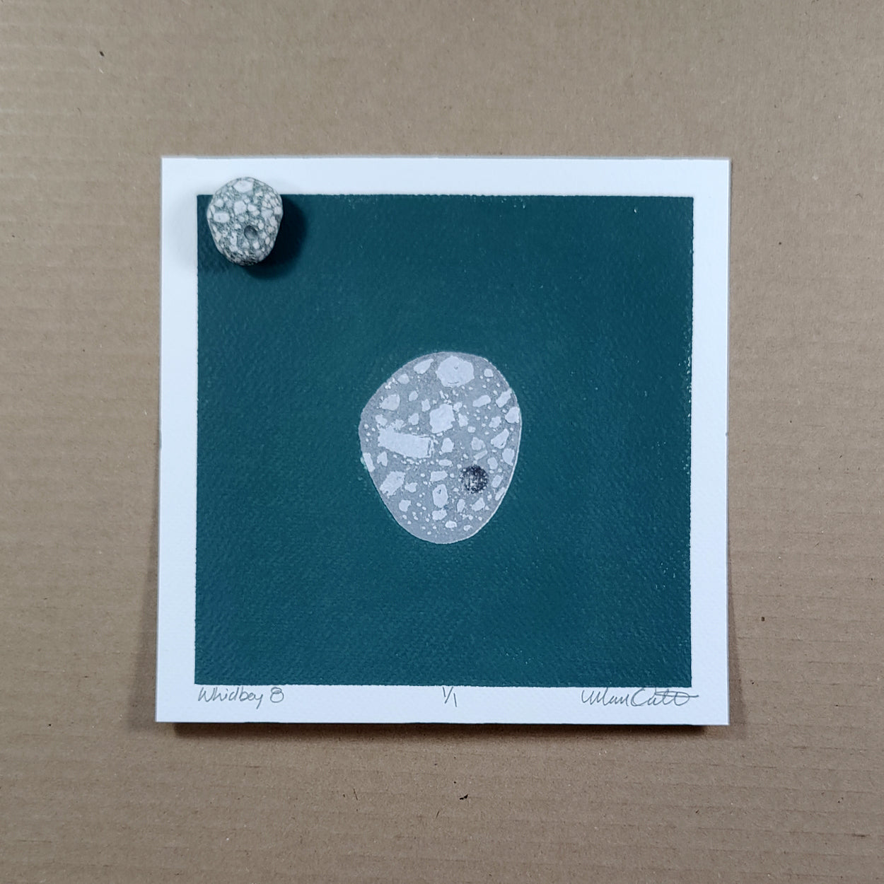 This printmaking method primarily uses acrylic paint, but some of my rocks use mixed media printing techniques such as oil pastel resists, soft pastel or charcoal transfers, or acrylic markers.